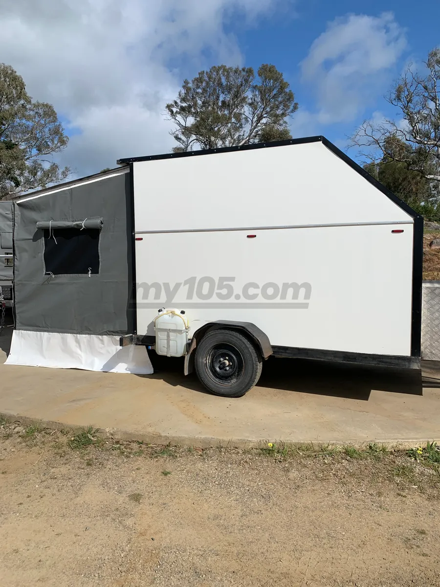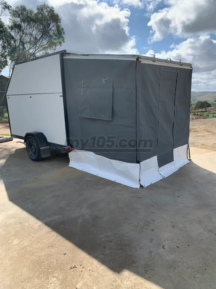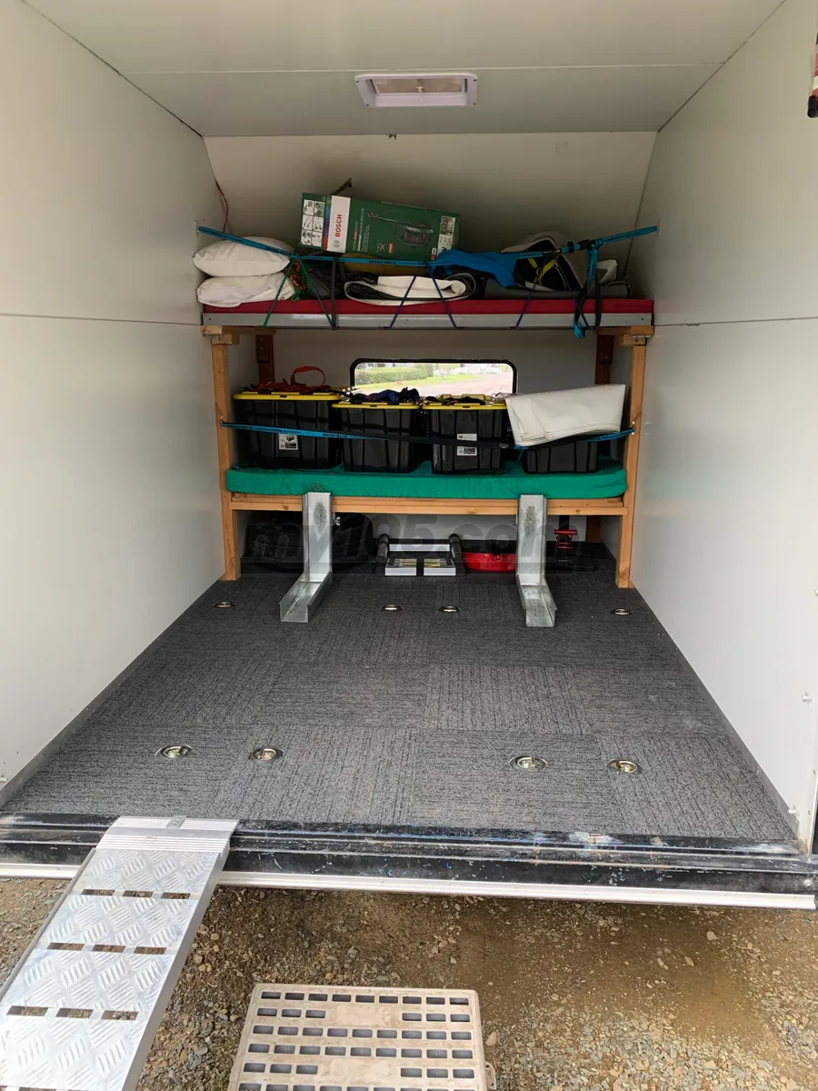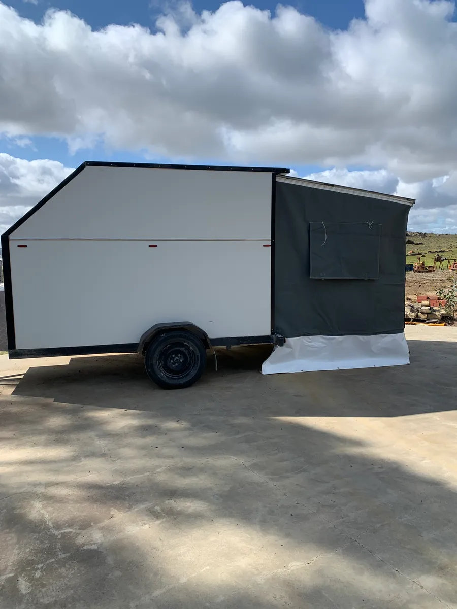 Fully insulator colour bond panels, with bunk beds up front, will fit 2 bikes, as new tyres , new electric brakes , new hub and wheel bearings, large aluminium tool box on draw bar, roof vent, fully enclosed canvas annex with zip up door and windows with heavy duty fly screens, carpet tiled floor, registered.